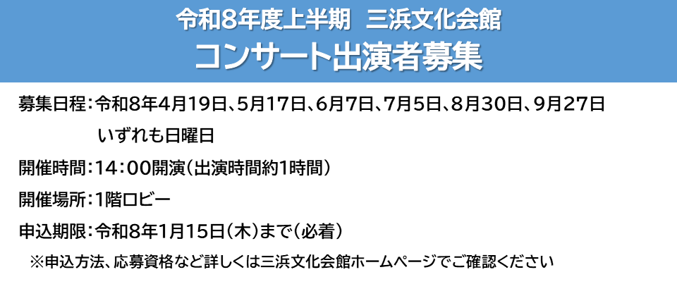 令和8年度上半期「三浜文化会館コンサート」出演者募集