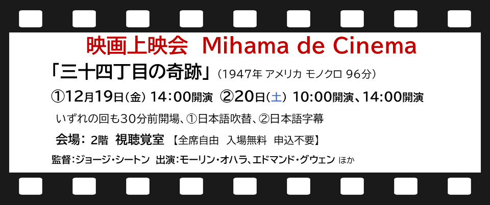 12月映画上映会(Mihama de Cinema)のご案内:12月19日、20日「三十四丁目の奇跡」(1947年アメリカ、モノクロ96分。19日吹替、20日字幕)