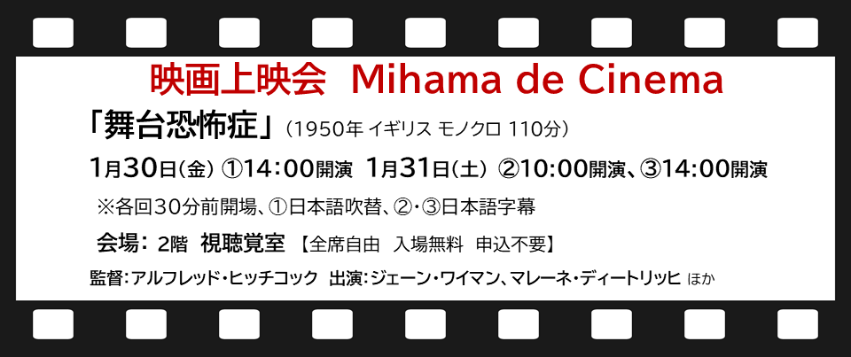1月映画上映会(Mihama de Cinema)のご案内:1月30日、31日「舞台恐怖症」(1950年イギリス、モノクロ110分、30日吹替・31日字幕)