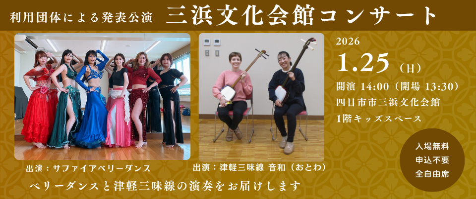 三浜文化会館コンサート「ベリーダンス・津軽三味線」1月25日(日)14:00~ 出演:サファイアベリーダンス、津軽三味線音和(おとわ)
