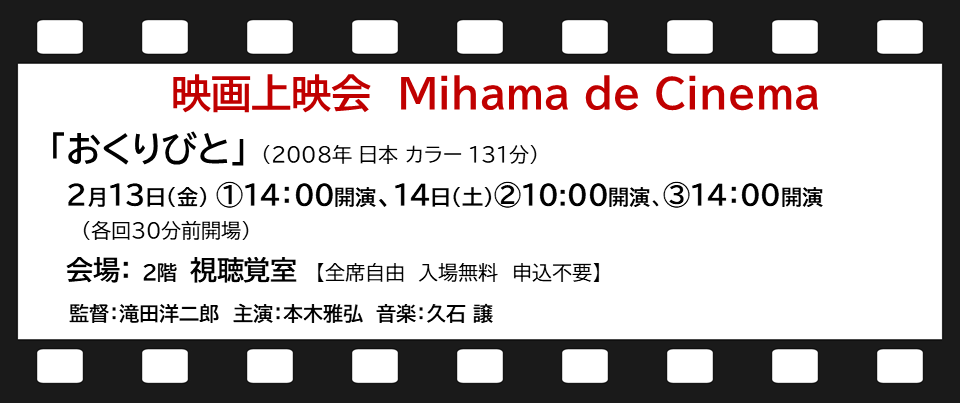 2月映画上映会(Mihama de Cinema)のご案内:2月13日、14日「おくりびと」(2008年日本、カラー131分)