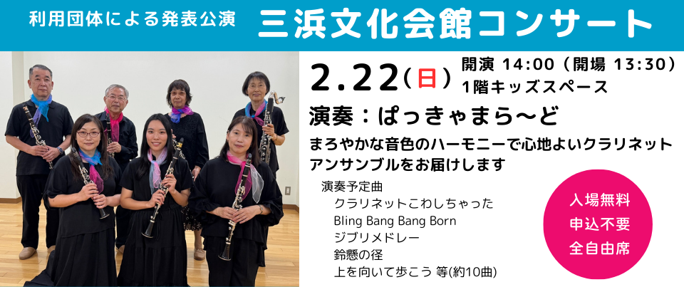 三浜文化会館コンサート 2月22日(日)14:00~ 出演:ぱっきゃまら~ど