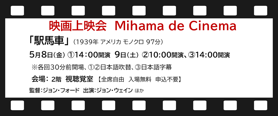 5月映画上映会(Mihama de Cinema)のご案内:8日、9日「駅馬車」(1939年アメリカ、モノクロ97分)
