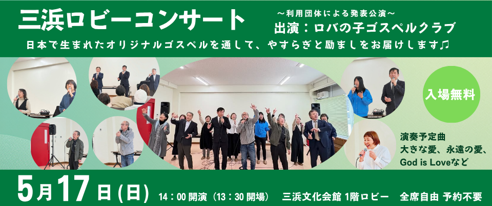 三浜文化会館ロビーコンサート 5月17日(日)14:00~ 出演:ロバの子ゴスペルクラブ
