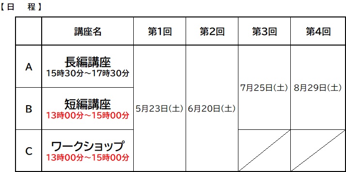 ※申込者多数の場合、<A長編講座>は提出書類による選考、<B短編講座>は抽選によって参加者を決めることとします。