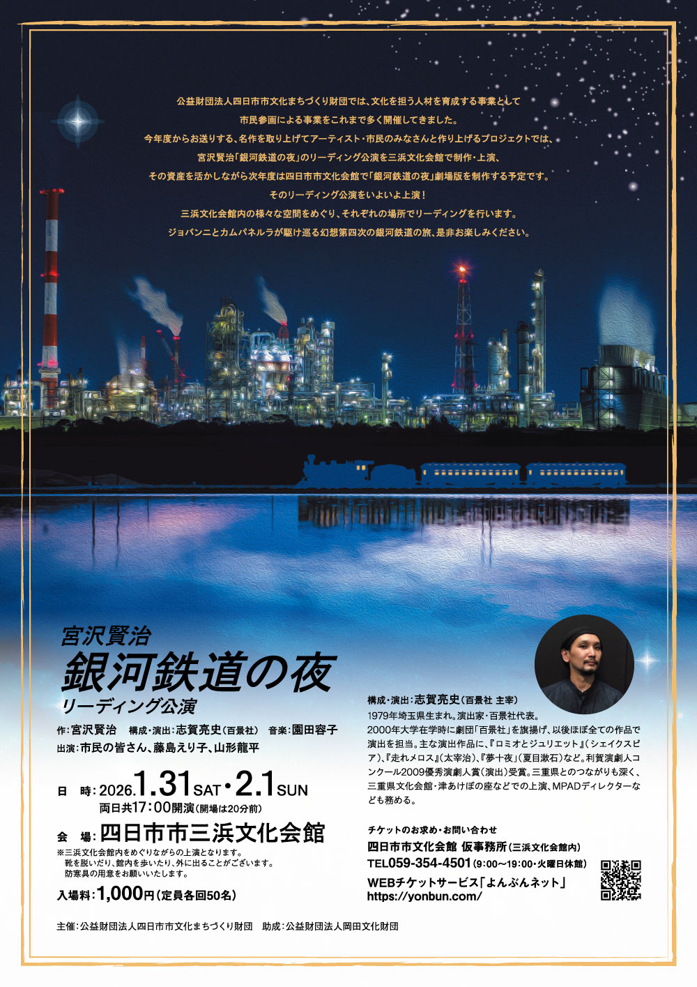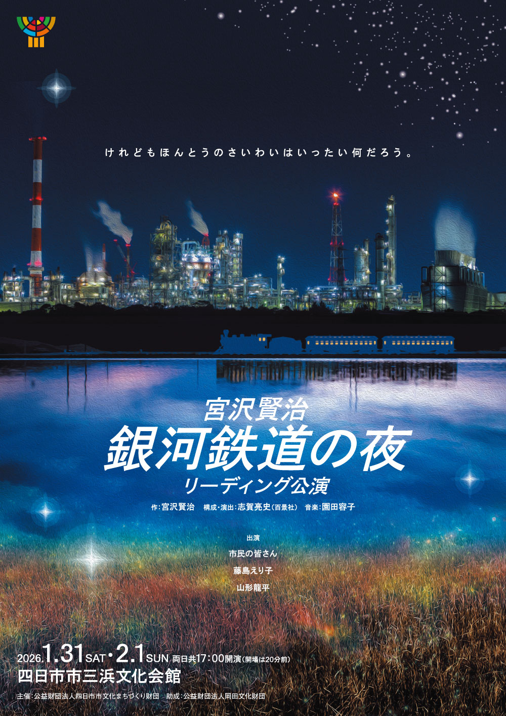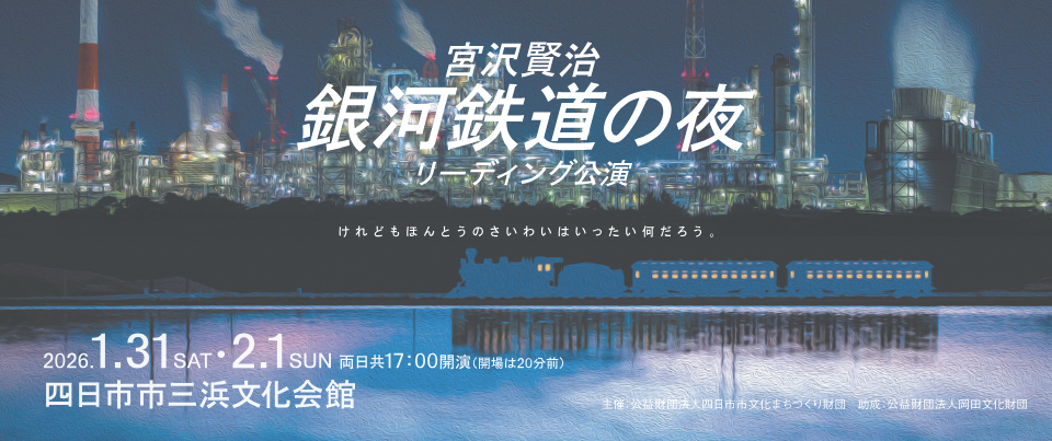 今年度からお送りする、名作を取り上げてアーティスト・市民のみなさんと作り上げるプロジェクトでは、宮沢賢治「銀河鉄道の夜」のリーディング公演を三浜文化会館で制作・上演、その資産を活かしながら次年度は四日市市文化会館で「銀河鉄道の夜」劇場版を制作する予定です。