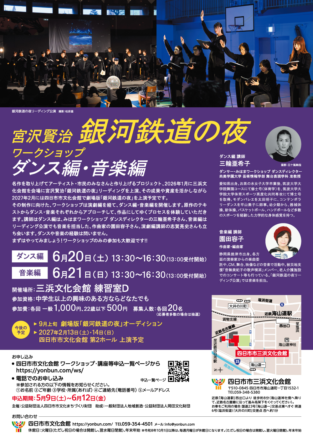 名作を取り上げてアーティスト・市民のみなさんと作り上げるプロジェクト、2026年1月に三浜文化会館を会場に宮沢賢治「銀河鉄道の夜」リーディングを上演、その成果や資産を活かしながら2027年2月には四日市市文化会館で劇場版「銀河鉄道の夜」を上演予定です。