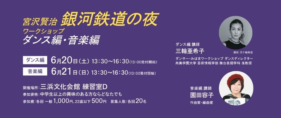講師はダンス編は、みはまワークショップ ダンスディレクターの三輪亜希子さん、音楽編はリーディング公演でも音楽を担当した、作曲家の園田容子さん。演劇編講師の志賀亮史さんも立ち会います。